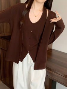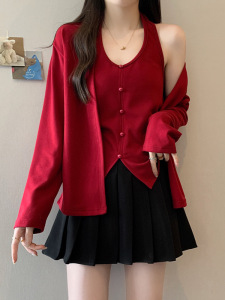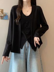 2025年秋装新款胖mm大码女时尚纯欲风挂脖v领背心+开衫外套套装