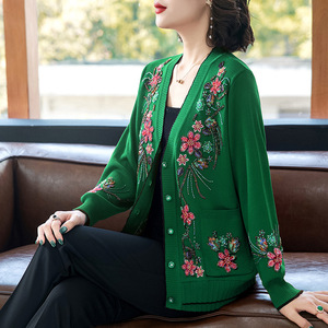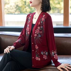 刺绣重工妈妈外套洋气中老年女秋装衣服老人春秋针织开衫老年上衣