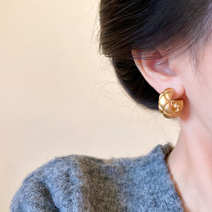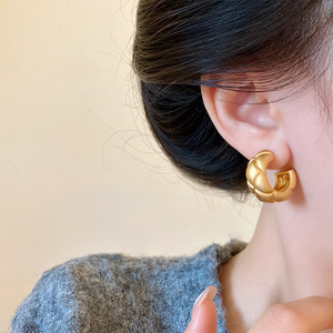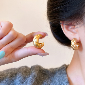 真金电镀哑光磨砂菱形格纹C形耳环925纯银针个性冷淡风金属感耳钉