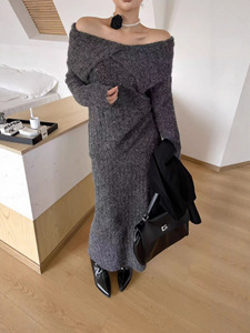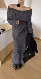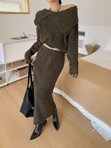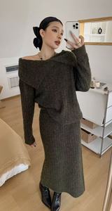 慵懒风不规则一字肩毛衣上衣+半身长裙两件套女秋冬百搭针织套装