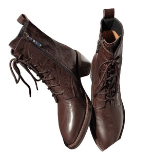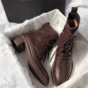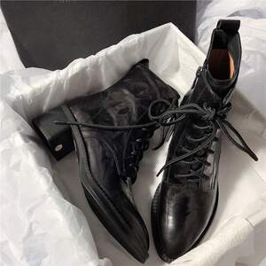 牛皮版~英伦风马丁靴女新款真皮前系带尖头增高粗跟侧拉链短靴子