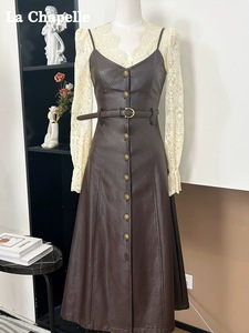 秋季穿搭套装2025名媛女装小香风V领打底衫咖色吊带连衣裙两件套
