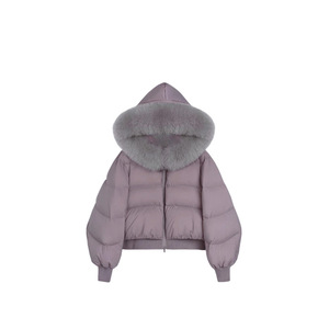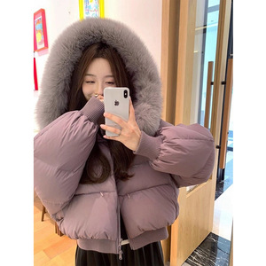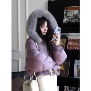 仿狐狸大毛领白鸭绒短款紫色羽绒服女2025冬季新款小个子加厚外套