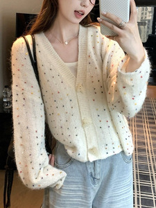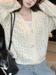 自留款推荐~设计感彩色亮片v领针织开衫女秋冬新款超漂亮毛衣外套