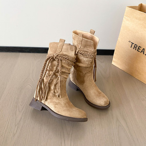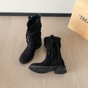 葡萄妈同款增高6公分圆头V口粗跟流苏大筒围褶皱堆堆短靴女41码