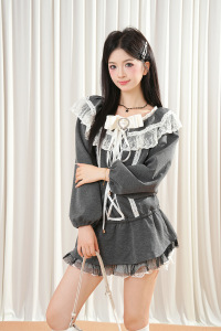甜美学院风设计感古着蝴蝶结蕾丝上衣米色短裤vintage气质两件套
