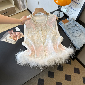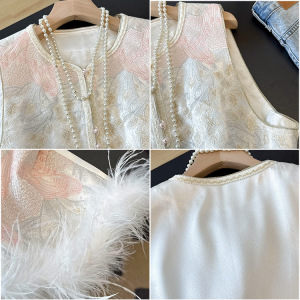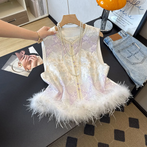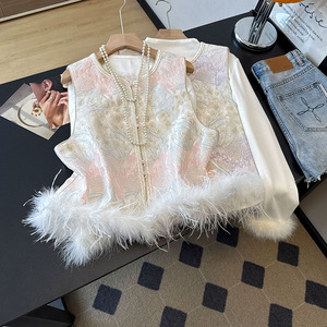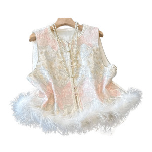 好质量中式国风马甲背心鸵鸟毛提花坎肩外搭丝盘扣马夹上衣女秋