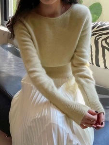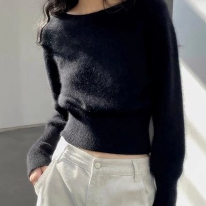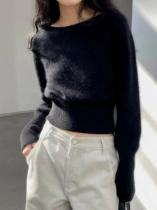 早秋新款一字领收腰短款山羊绒女欧货秋冬软糯短打底羊毛毛衣