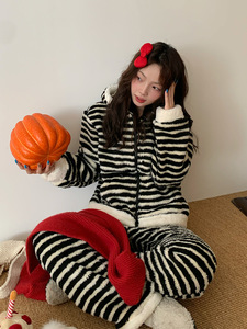 实体批发女装家居服洋气秋冬毛绒防寒保暖女士珊瑚绒条纹睡衣套装