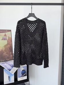 25早秋女士新品V领编织镂空亮片亚麻混纺宽松百搭针织衫长袖毛衣