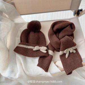 韩版儿童帽子围巾两件套冬季女童蝴蝶结毛球针织帽ins风保暖围脖