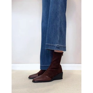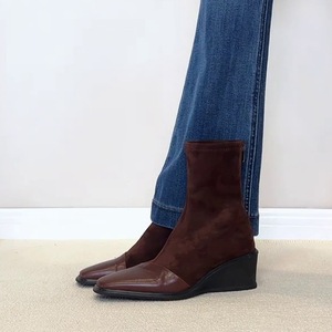 羊皮版~厚底坡跟弹力瘦瘦靴复古方头短靴女后拉链袜靴显瘦马丁靴