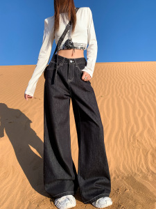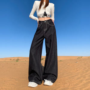 新款美式复古宽松显瘦遮胯牛仔阔腿裤明线设计垂感直筒拖地长裤女