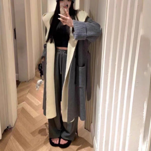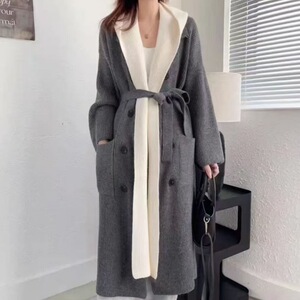 韩国东大门加厚连帽针织开衫女秋冬宽松慵懒风假两件毛衣外套大衣