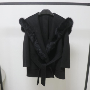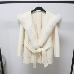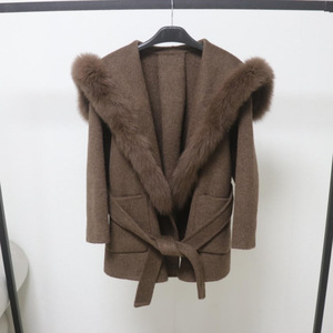 欧洲站秋冬新款双面羊毛大衣中长款海军领毛呢外套狐狸毛皮草领