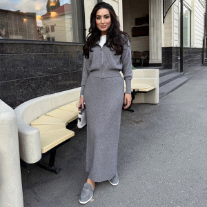 欧美跨境女装2025秋冬新款休闲拉链连帽针织外套高腰半身裙套装