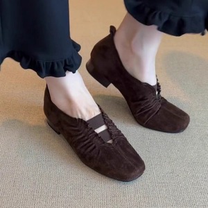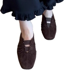 羊皮版~复古方头花边褶皱松紧带玛丽珍女软底一脚蹬休闲浅口单鞋