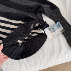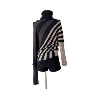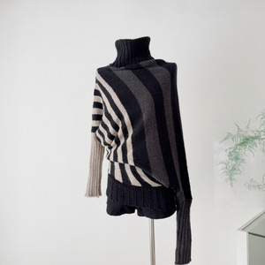 塞纳韩系复古蝙蝠衫 上下可反穿多造型黑白灰羊毛混纺条纹毛衣女