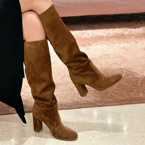 羊皮版~复古美拉德不过膝尖头小个子长筒靴女瘦瘦高跟长筒骑士靴