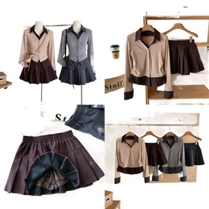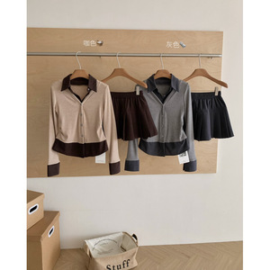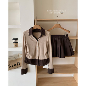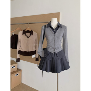 塞纳2025早秋季学院风穿搭一整套女撞色翻领长袖针织开衫百褶裙女