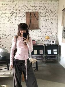 韩系辣妹斜肩设计感长袖t恤女2025秋季新款收腰修身显瘦腰绳上衣