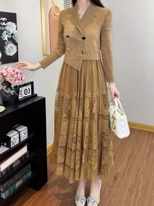 三宅烫金蕾丝拼接2025新款褶皱轻奢女装连衣裙气质通勤女长裙