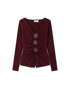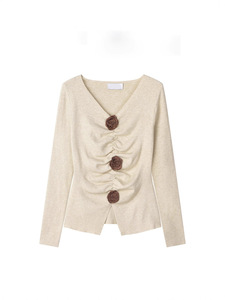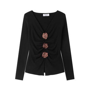 韩系气质风设计感立体花朵V领长袖毛衣女秋冬显瘦减龄内搭针织衫
