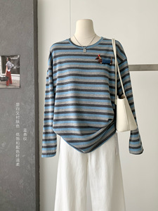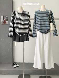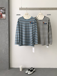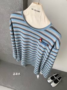 实拍张贝贝ibel手作腊肠狗布艺日系减龄廓形宽松撞色条纹长袖圆领
