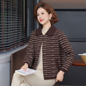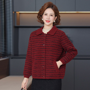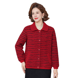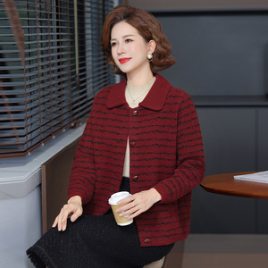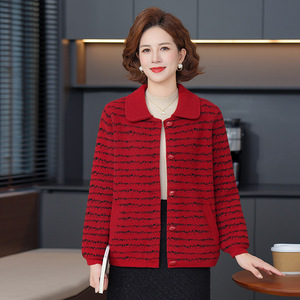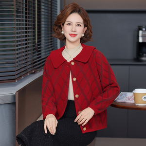 45岁妈妈装秋冬红色翻领格子外套中年女装洋气秋装毛呢短上衣开衫