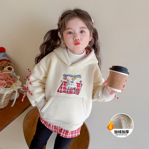女童加绒加厚卫衣秋冬装2025新款儿童洋气女宝宝格子拼接连帽上衣