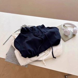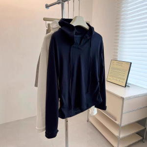 外贸韩系麻感棉纯色连帽衫短款V领长袖T恤秋女设计感捏褶收腰显瘦