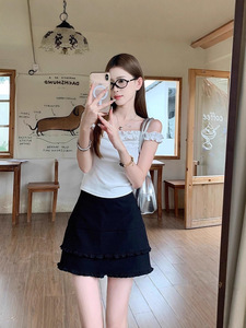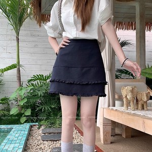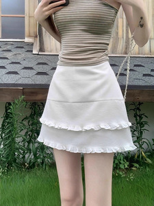 大码韩系藏青色双层木耳边高腰辣妹半身裙女夏季新款显瘦A字短裙