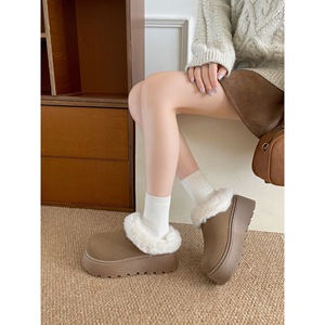 黑色复古加绒厚底半拖勃肯鞋女款2025新款冬季保暖包头雪地棉拖鞋