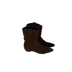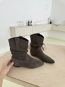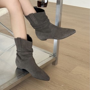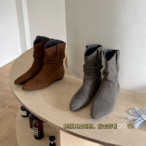 2025年秋冬韩版真皮粗跟增高堆堆中筒骑士短靴女尖头V口瘦瘦靴女