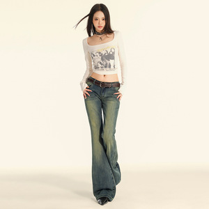 秋季女款美式辣妹复古高弹低腰水洗做旧微喇显瘦牛仔
