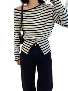 斜肩针织打底衫小个子温柔时尚感百搭显瘦收腰开叉条纹毛衣女秋冬