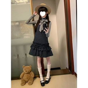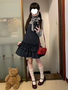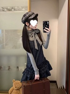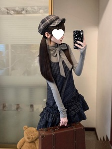 少女心事 秋装新款日系古早vintage设计蝴蝶结上衣格纹连衣裙套装