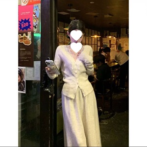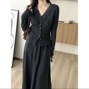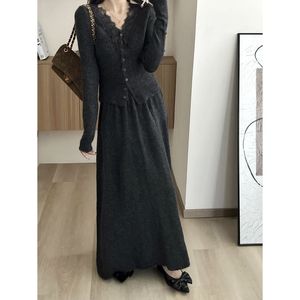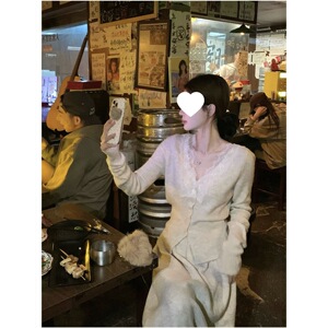 韩系蕾丝长袖针织开衫秋冬拼接法式气质上衣半身裙套装两件套