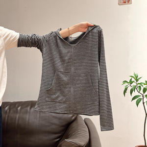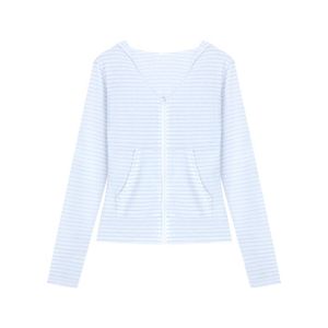 连帽条纹拉链长袖恤上衣女早秋季韩系薄款休闲百搭防晒开衫短外套