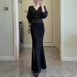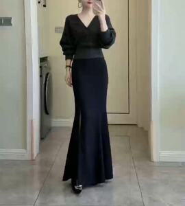 25929新大爱美依缘2025秋季新款高端V领宽松上衣开叉鱼尾半身裙女