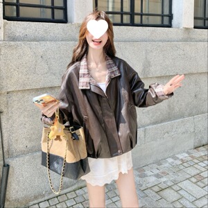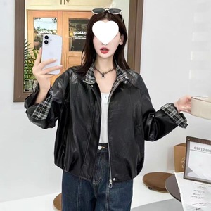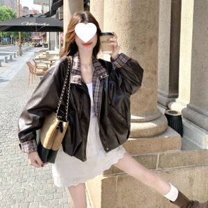 短款格子拼接洋气皮衣外套女2025秋季新款小个子复古机车夹克上衣