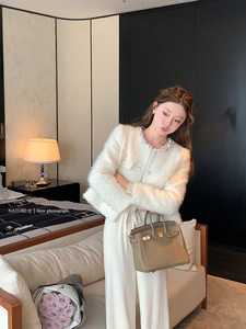 杨小卷法式珍珠领白色羊毛小香风外套女短款富家千金感羽绒服新款
