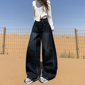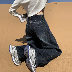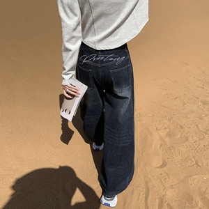 美式刺绣弯刀阔腿牛仔裤女秋季新款蓝灰色显瘦直筒高腰宽松拖地裤