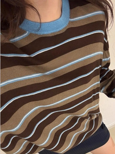 美式复古咖色条纹套头正肩长袖T恤设计感绝美巨好看的小上衣秋季