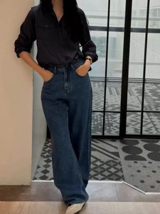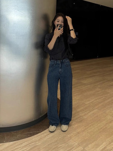 现 th*banrnnet八奶深色牛仔裤韩国设计师女装直筒休闲韩系长裤子