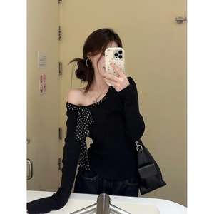 实拍~设计感小众波点系带飘带斜肩修身显瘦长袖针织衫上衣女89536