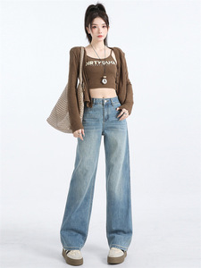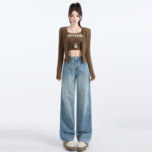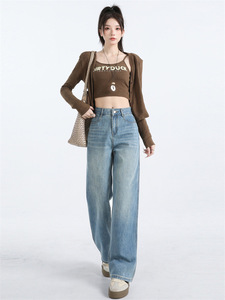 浅蓝色高腰简约阔腿牛仔裤女2025秋季爆款宽松直筒显瘦窄版拖地裤