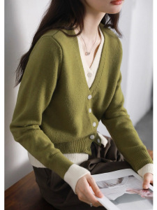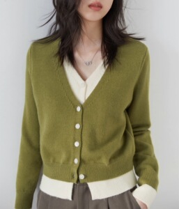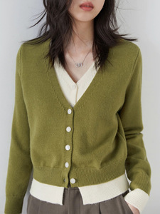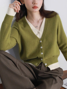 CHICVE「城市寻觅」秋季正肩V领撞色假两件单排扣毛针织开衫长袖