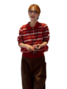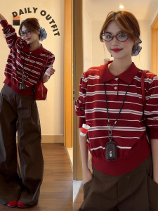 早秋季长袖t恤女2025新款设计感红色条纹针织polo衫上衣长裤套装