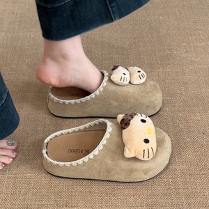 漂鸿绒面卡通女生平底拖鞋夏秋季小猫咪休闲厚底一脚蹬包头拖鞋潮
